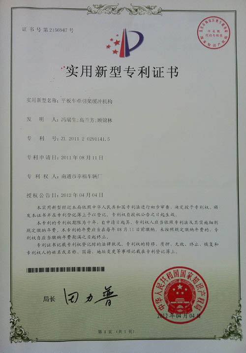平板車(chē)牽引架緩沖機(jī)構(gòu)專利證書(shū)