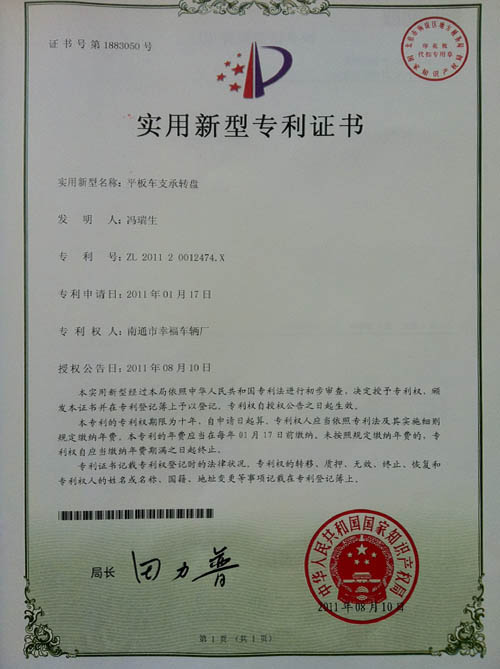 平板車(chē)支承轉(zhuǎn)盤(pán)專(zhuān)利證書(shū)